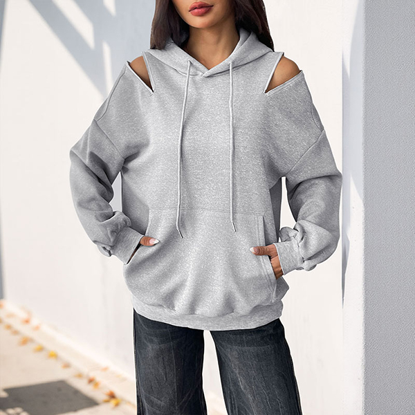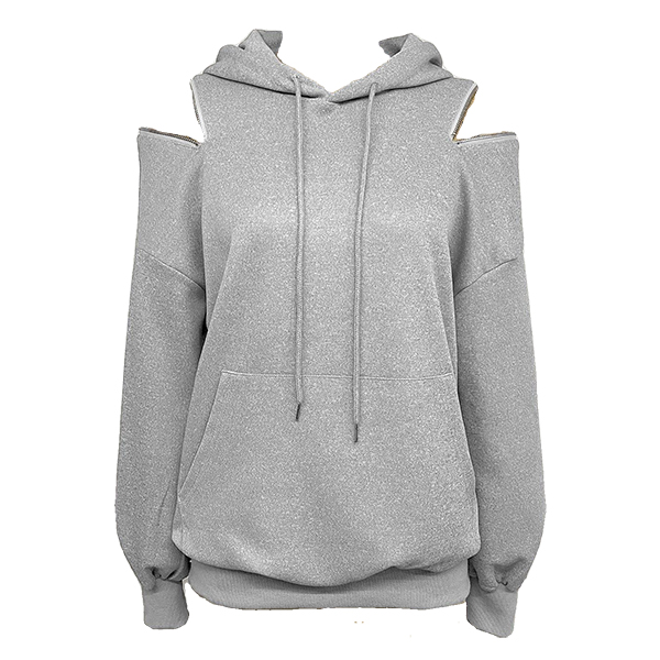 Casual Zipper Open-shoulder Long Sleeve Pullover Sweatshirt with Drawstring Hooded and Kangaroo Pocket