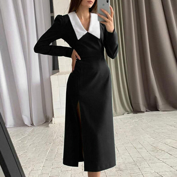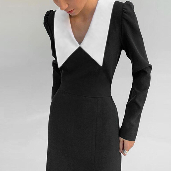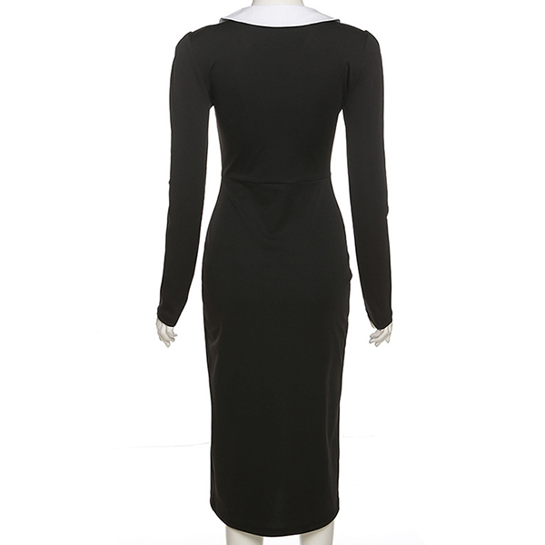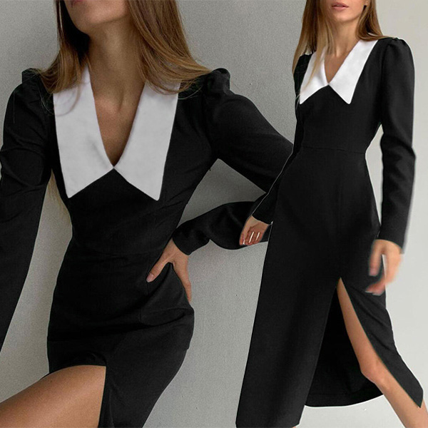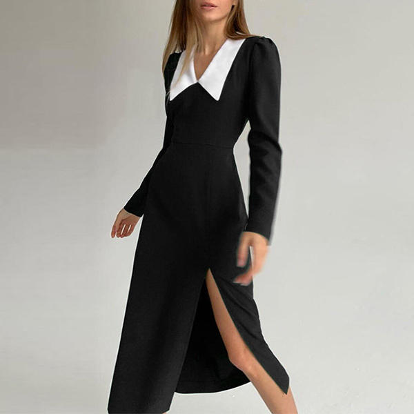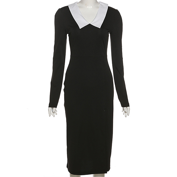 This dress is designed with white collar,which breaks the simple and dull design style,while the slit hem design gives you the chance to showcase your slender legs. Finished with long sleeve and a fit silhouette,this dress also can portray your slender figure. When you have the worries about what to wear for your daily out,then you can just turn to this dress.