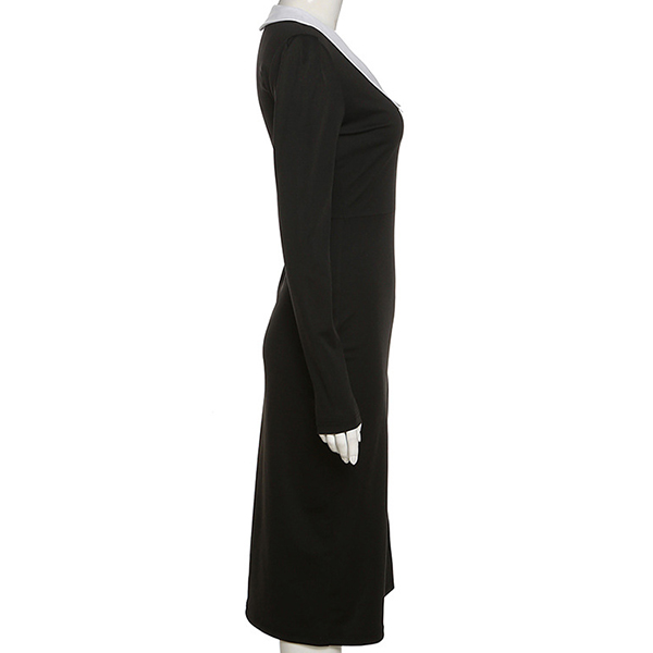 OL Style Contrast Color Long Sleeve Slit Hem Slim Fit Dress