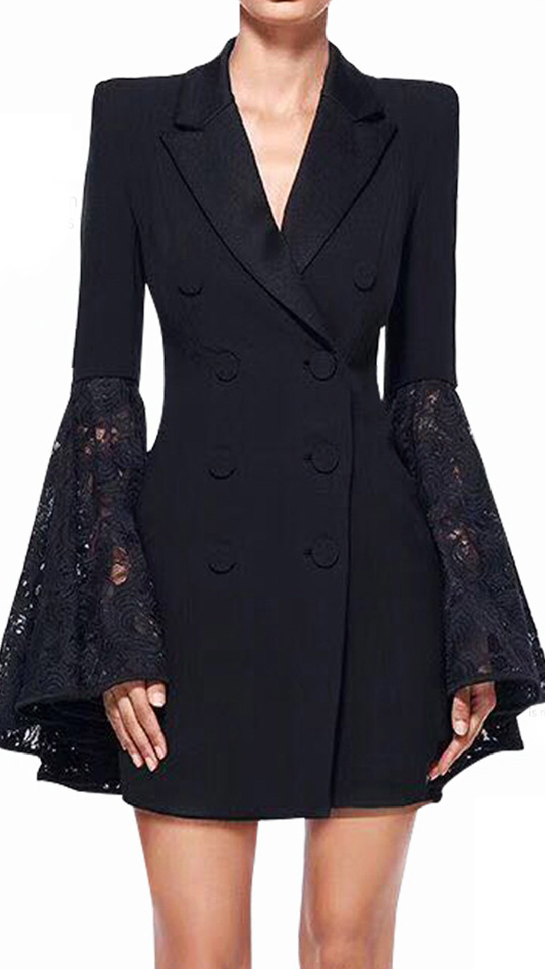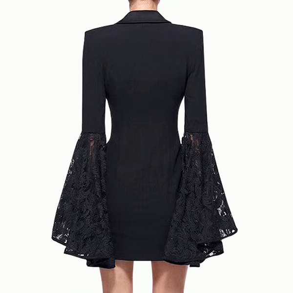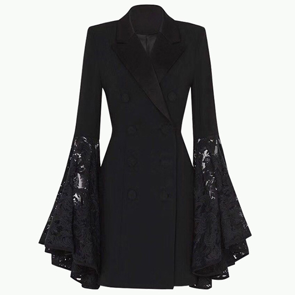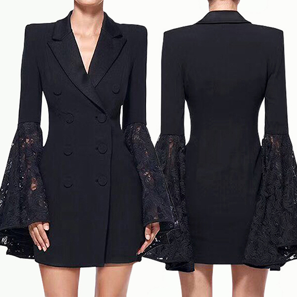 For some formal occasions,you can trust in this suit dress to have a delicate,elegant and confident image. Comes with a flattering black tone,finished with double-breasted and a fit silhouette,this suit dress also can showcase your slender figure. Moreover,the lace spliced trumpet sleeve design will make this piece look more distinctive and attractive. You can easily be the focus in this dress.
