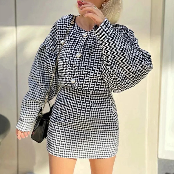 For these office ladies,this two-piece set can be their wise choice. The houndstooth element design makes it look so stylish,popular and eye-catching. Including a long sleeve round neck crop top and a high waist skirt,this two-piece set not only can showcase your figure,but also can exude your style and charm.