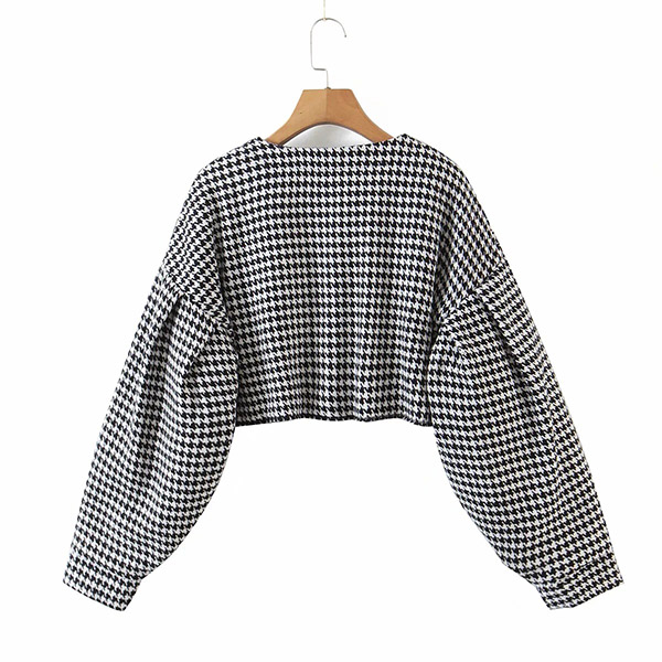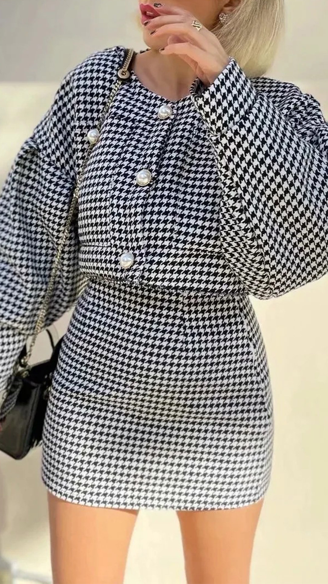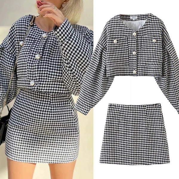 OL Style Lantern Sleeve Round Neck Houndstooth Crop Top + Skirt Two-piece Set