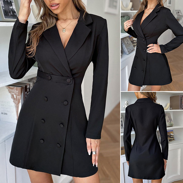 For a delicate and elegant working look,you can just have a try this suit dress. Comes with a classic yet flattering black tone,finished with long sleeve,notched lapel and double-breasted design,this dress not only can showcase your figure,but also can exude your flirty yet feminine side. Perfect fit for your working occasions.