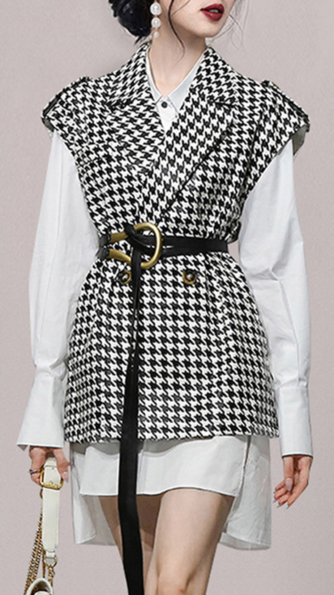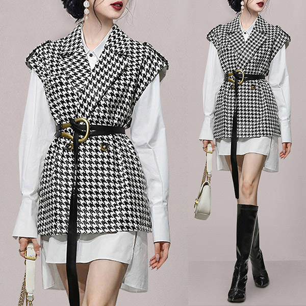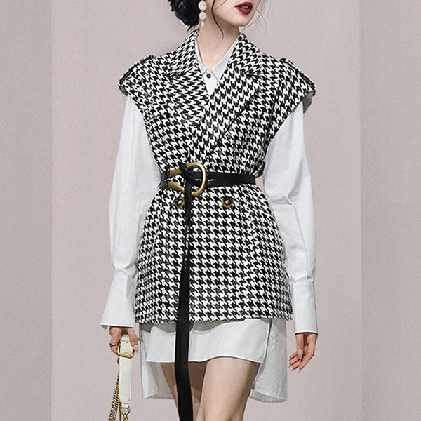 In these early autumn days,this two-piece set would offer you a delicate,stylish and elegant look. Including a long sleeve high-low hem white shirt and a houndstooth vest,this two-piece set can help you catch more eyes. And the unique waistband design is the highlight. For your working occasions and weekend out,you can trust in this two-piece set to express your beauty.