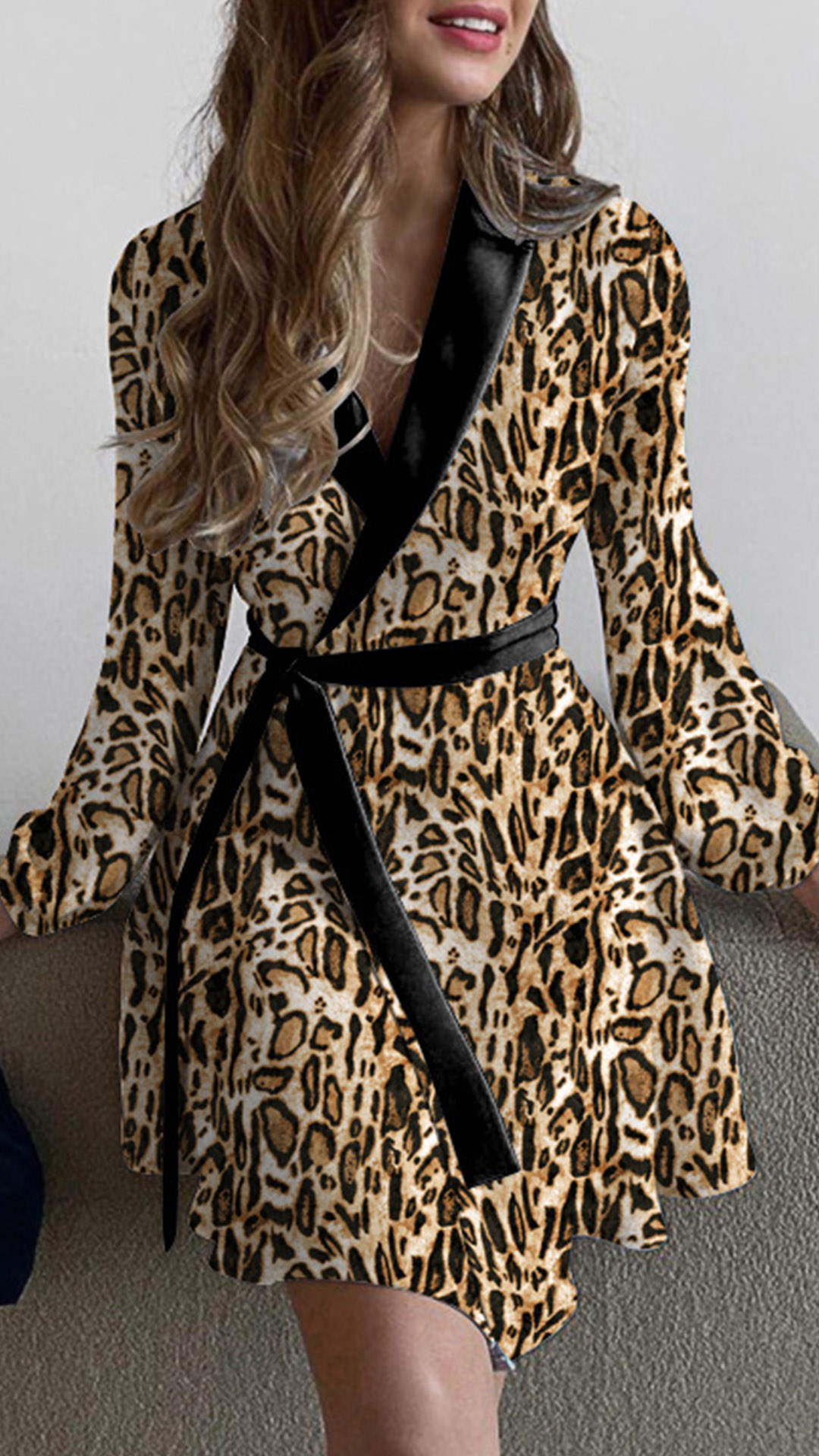 OL Style Long Sleeve Lapel Tie-belt Printed Dress