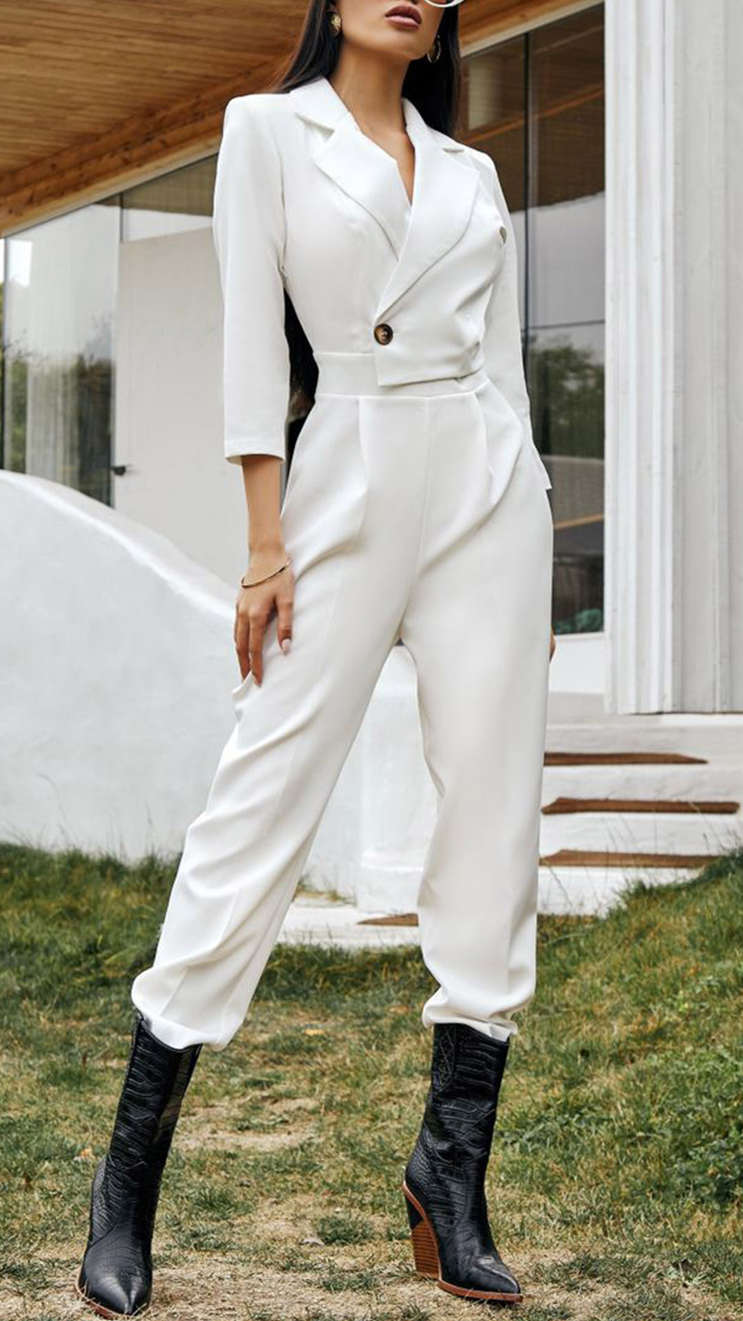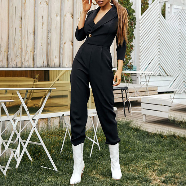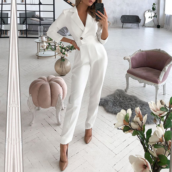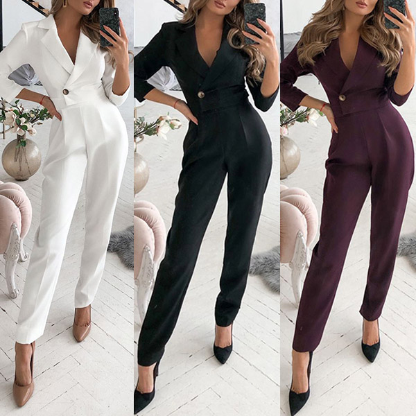 As for your some formal working occasions,you can trust in this delicate jumpsuit to portray your charming and confident image. Solid color style,finished with long sleeve,notched lapel,high waist and a clean silhouette,this piece definitely can showcase your slender figure as well as exude your flirty appeal.