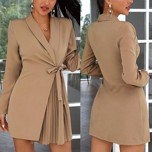 For your working days,this elegant and delicate suit dress can be your wise choice. What makes this piece look so distinctive? It owes to the pleated hem design. And the lace-up design at the waist part can better showcase your figure and waist. For some formal working occasions,this suit dress can easily strike your mind.