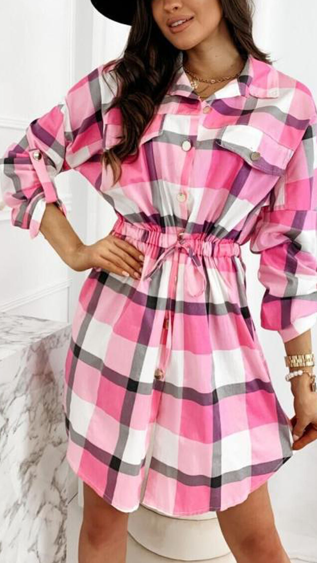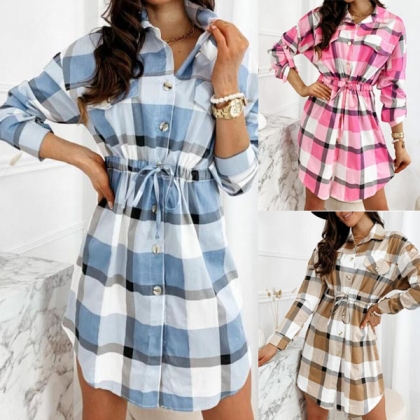 As for your busy workdays,you must have no time to think about what to wear. So might we suggest you choosing this shirt dress? The plaid element design makes it look so stylish and attractive. Finished with long sleeve,POLO collar and drawstring waist,this piece not only can showcase your slender figure,but also can maintain the comfy and style. You can just dress it up with your favourite heels to start your wonderful day.