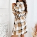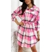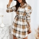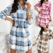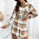 OL Style Long Sleeve POLO Collar Drawstring Waist Plaid Shirt Dress