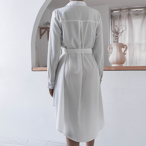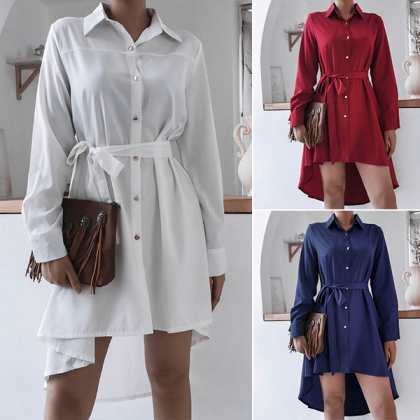 For a delicate and stylish working look,you can just have a try this shirt dress. Solid color style,finished with long sleeve,POLO collar and high-low hem design,this shirt dress can portray your elegant and charming image. Comes with a waist strap design,which can showcase your slender waistline. Just invite this piece to your wardrobe and it won't let you down!