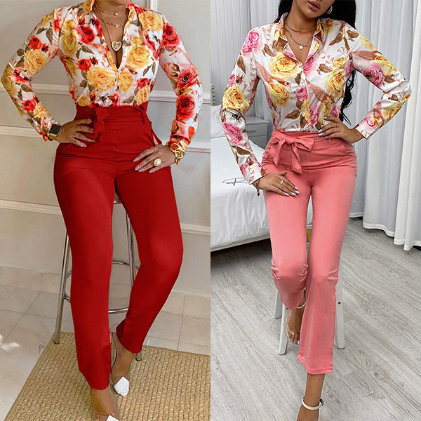 Wanna a delicate and charming working look,then you can just rest easy if you have this two-piece set in your team. It consists of a long sleeve POLO collar printed shirt and a high waist slim fit pants,this two-piece set not only can easily showcase your slender figure,but also can exude your charming femininity. When stepping into your office with this two-piece set,you can easily win more eyes.