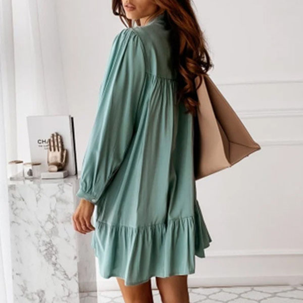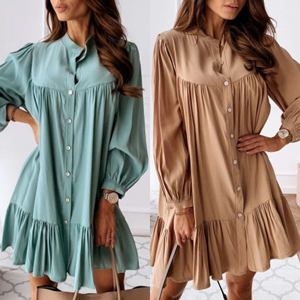 OL Style Long Sleeve Stand Collar Ruffle Hem Shirt Dress