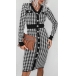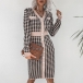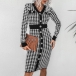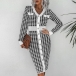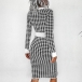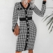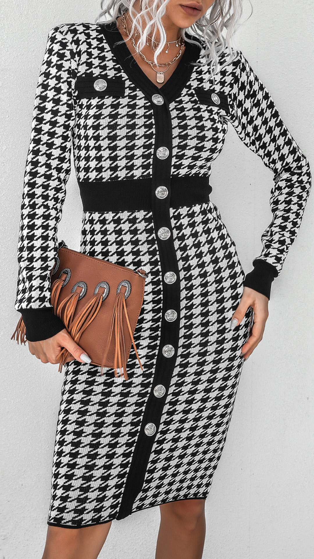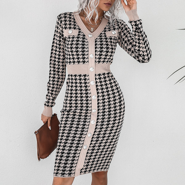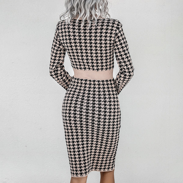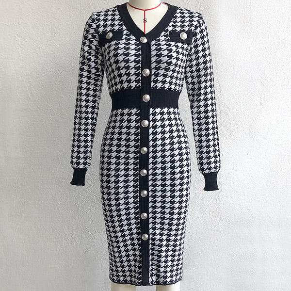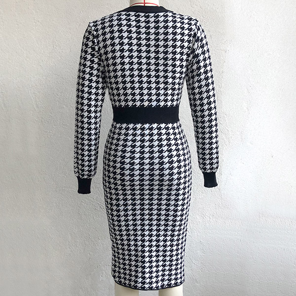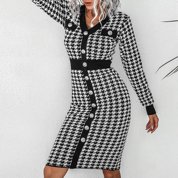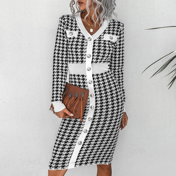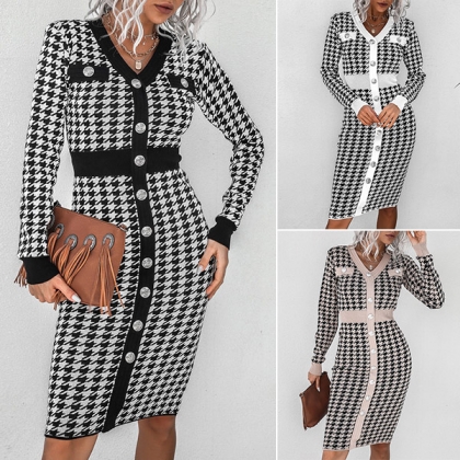 OL Style Long Sleeve V-neck Single-breasted Contrast Color Houndstooth Knit Dress