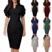 OL Style Lotus Sleeve V-neck High Waist Solid Color Slim Fit Dress