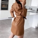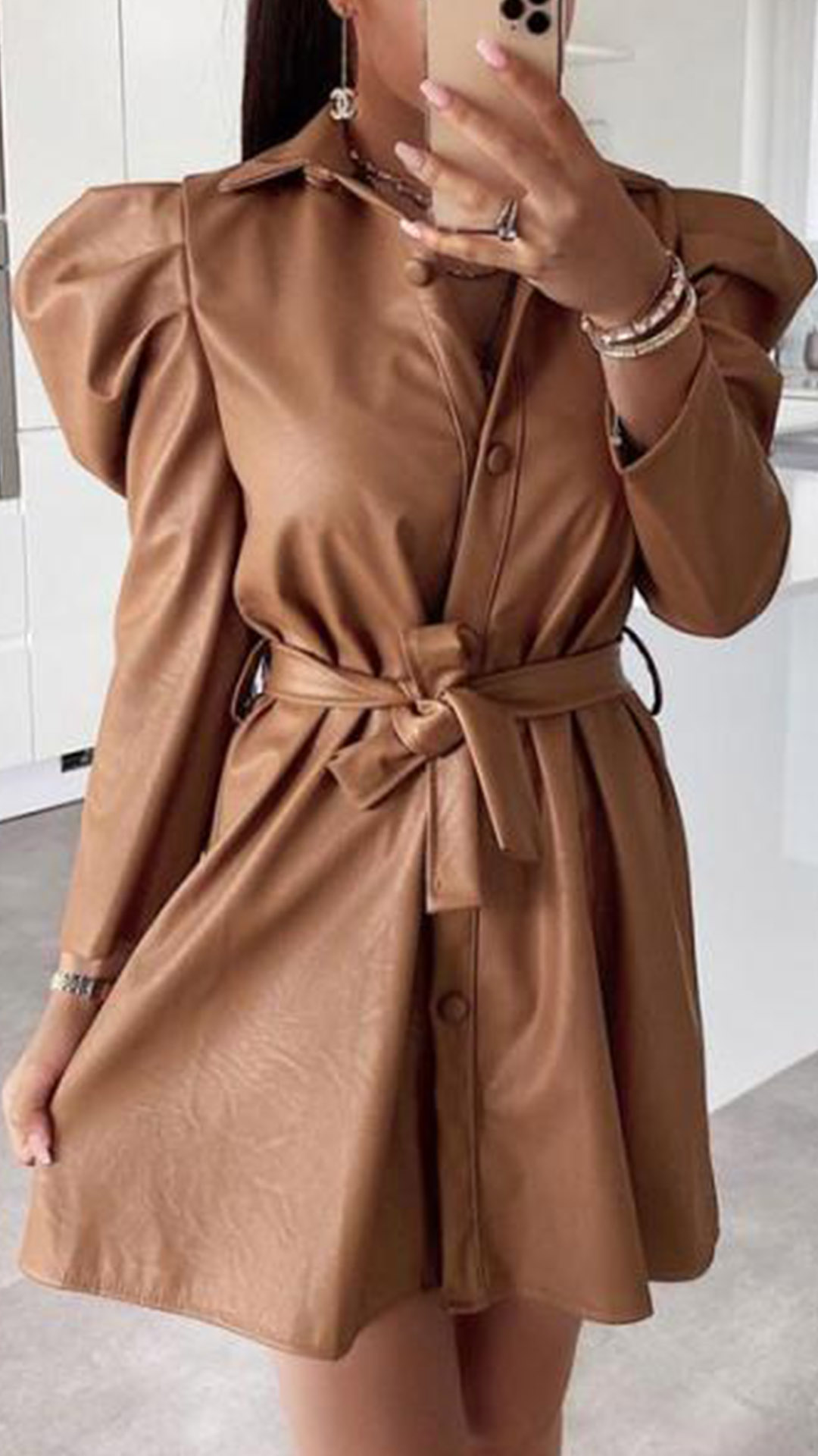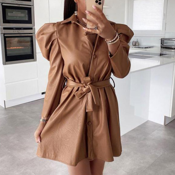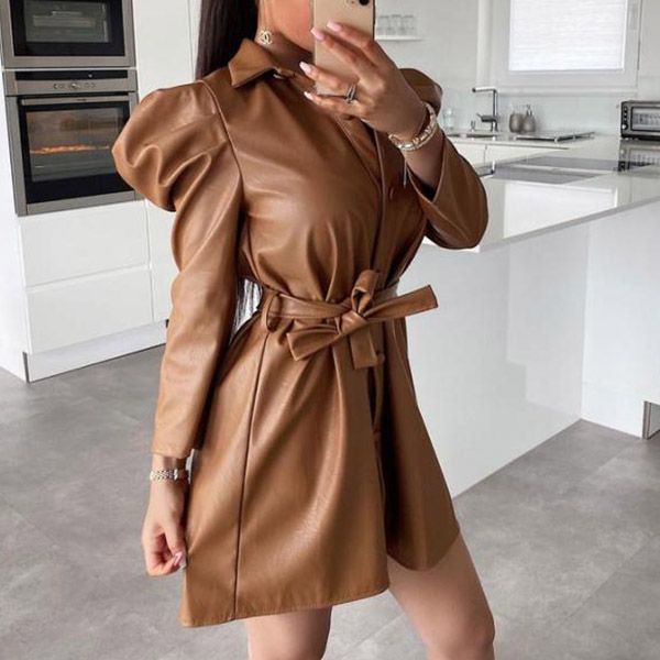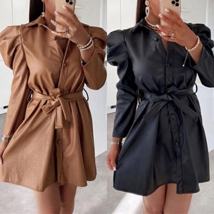 Your style can have an instant boost when you wear this PU leather dress. Solid color tone design makes it look simple,stylish yet generous. Finished with POLO collar,puff sleeve and single-breasted design,this delicate dress is perfect fit for your workdays and weekend out.