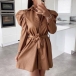 OL Style Puff Sleeve POLO Collar PU Leather Dress