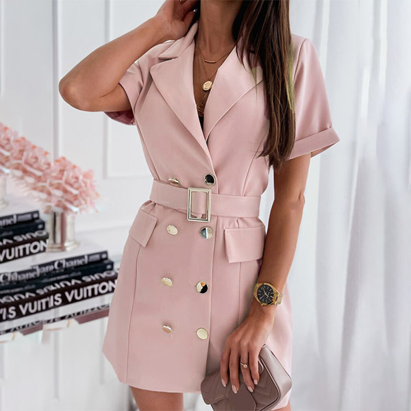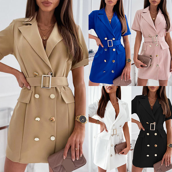As for a delicate,elegant and charming working look,you can just have a try this dress. It comes with a solid color,finished with short sleeve,notched lapel,double-breasted and a clean,fit silhouette,this dress knows how to portray your slender figure as well as express your charm and style.