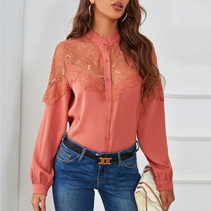 If you are looking for a shirt which is not so formal,then you can make your eyes focused on this piece. Solid color style,the long sleeve,POLO collar and single-breasted design maintain the classic design style,while the lace spliced details will enhance your feminine appeal. You can match it with your suit pants to achieve for a delicate,charming working look.