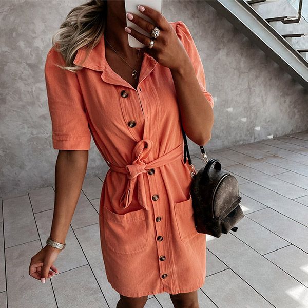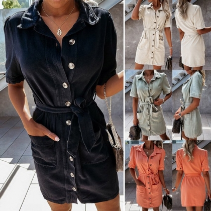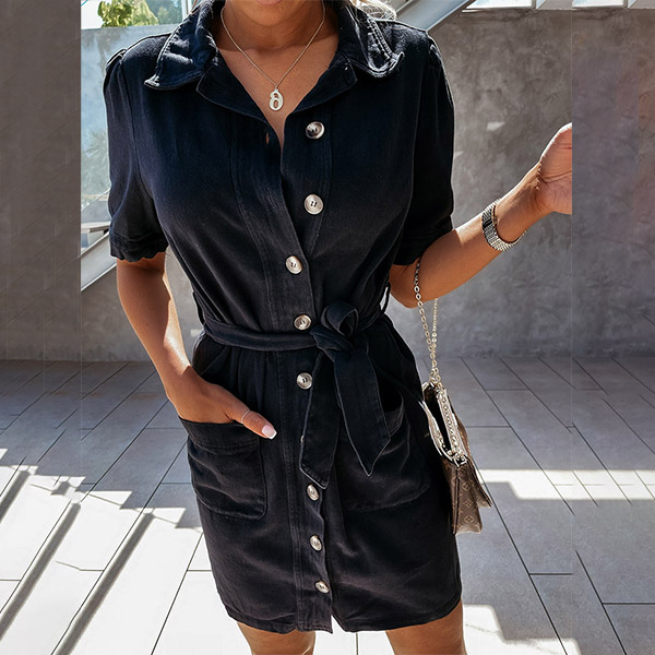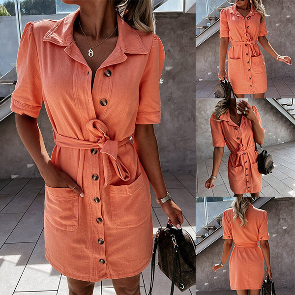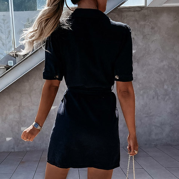 When you don't know what to wear for your busy workdays,then you can just make your eyes focused on this shirt dress. It comes with a solid color,finished with short sleeve,POLO collar and single-breasted design,this piece can keep the comfy as well as maintain your style. You can just dress it up with your favourite shoes to start your wonderful day.