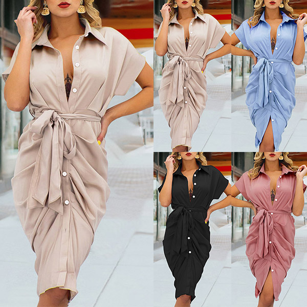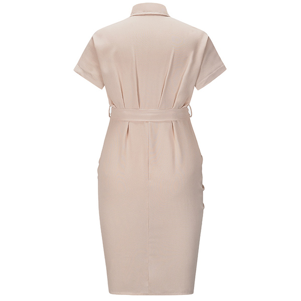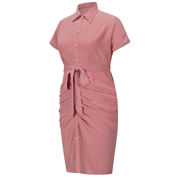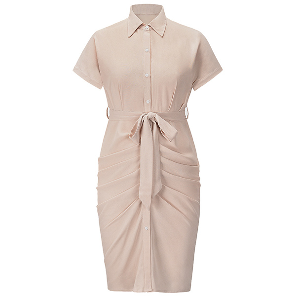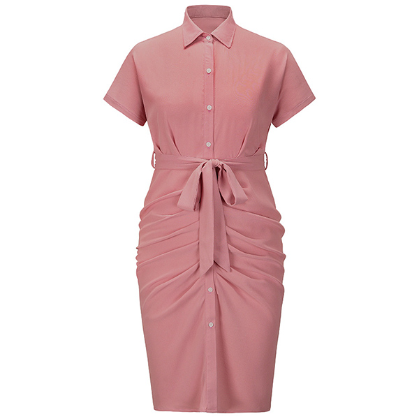 As for your busy workdays,this OL style shirt dress can easily strike your mind. Solid color style,the short sleeve,POLO collar and single-breasted design maintain the classic design style,while the tie-belt and wrinkled details will further enhance its charm. You can trust in this dress to express your beauty and charm.
