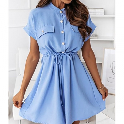 OL Style Short Sleeve Stand Collar Drawstring Waist Solid Color Shirt Dress