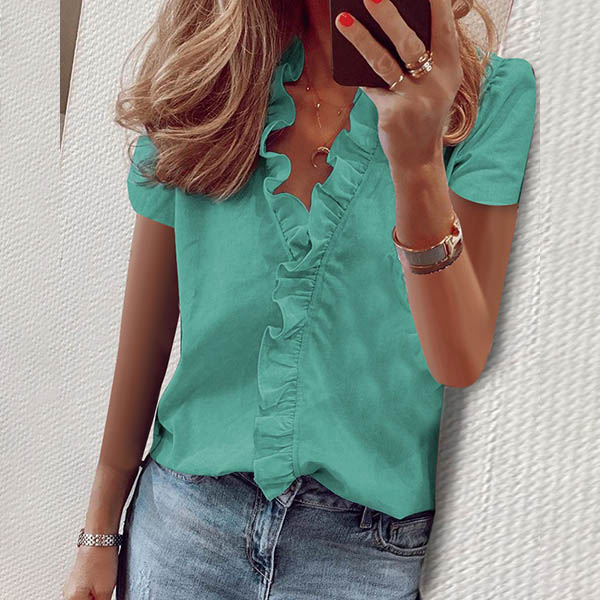 For your busy workdays,you can trust in this blouse to give you a stylish and delicate working look. Solid color style,finished with short sleeve,v-neck and ruffle design,this wonderful piece not only can give you the comfy,but also can offer you different matching styles.