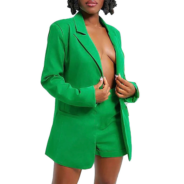 Features bright green color,eye-catching and stylish. Including a blazer and a shorts.