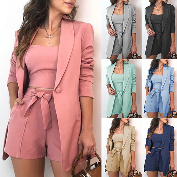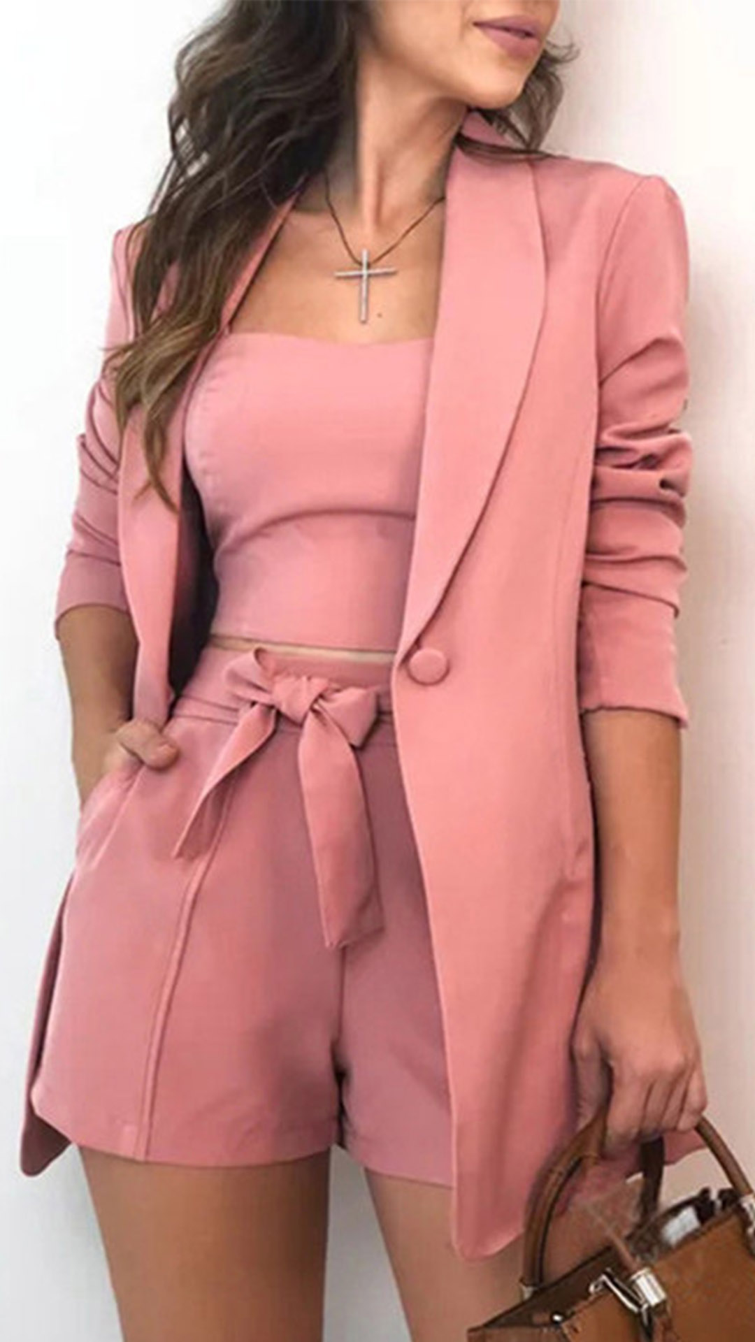 When it comes to a delicate,elegant yet charming working look,you can just have a try this three-piece set. Solid color style,including a sleeveless crop top,a high waist shorts and a long sleeve blazer,this three-piece set can portray your elegant and confident side. When stepping into your office with this three-piece set,you can easily arouse your colleagues' envious eyes.