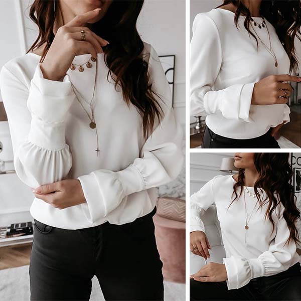 If you wanna a stylish,delicate and elegant working look,then you can have a try this blouse. It features a classic yet stylish white tone,finished with trumpet sleeve and round neck design,stylish yet feminine. You can simply match with your favourite bottom to finish a charming dress up.