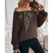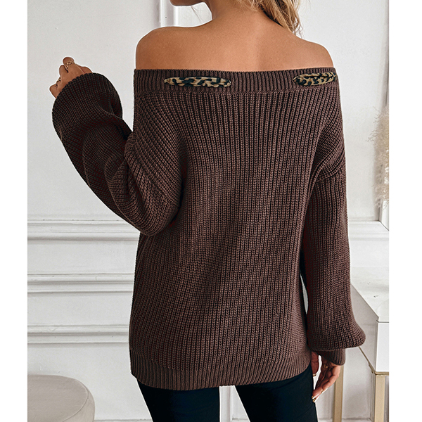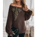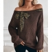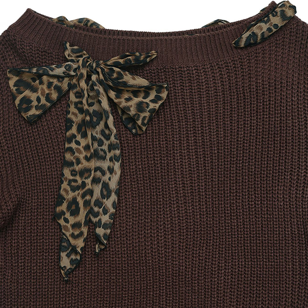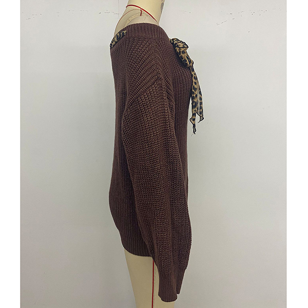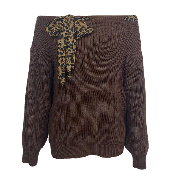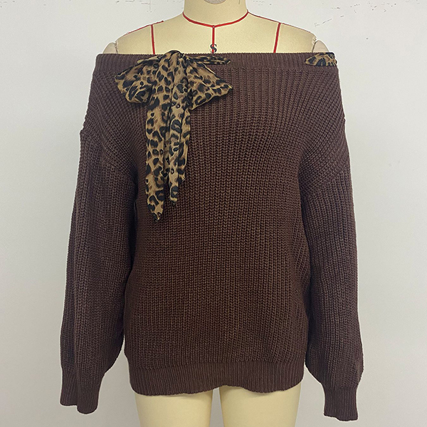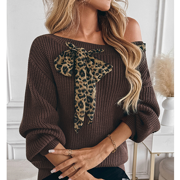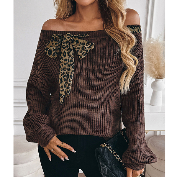 Fashion Off-the-shoulder Long Sleeve Sweater with Leopard Printed Bowknot