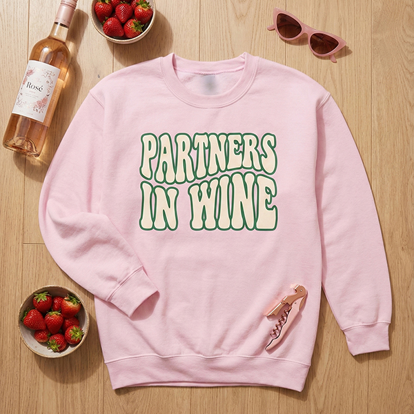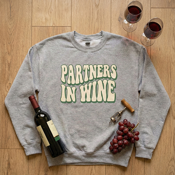 Are you looking for the perfect outfit for your next girls' getaway or winery tour? Look no further! Our "Partners in Wine" Sweatshirt is the must-have item for you and your favorite drinking buddy.