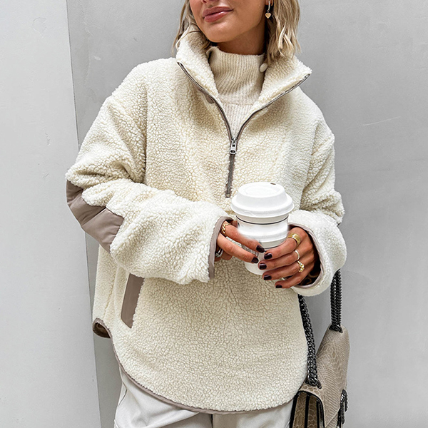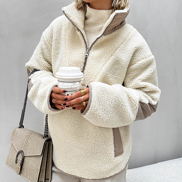 Fashion Half-zipper Stand Collar Patch Spliced Long Sleeve Plush Sweatshirt