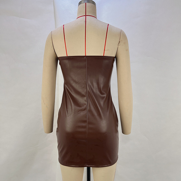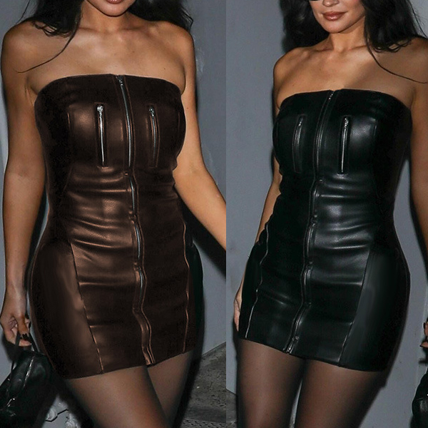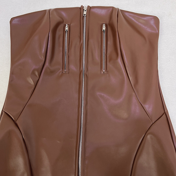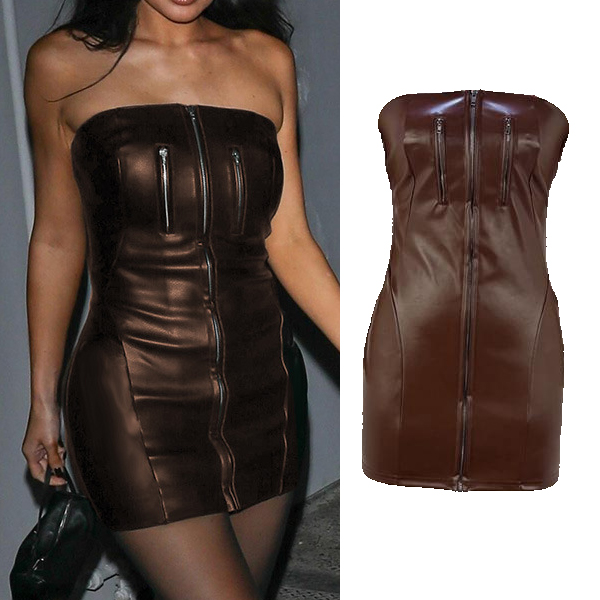 PU Leather Tube Top Dress with Zipper Waist Hip Skirt