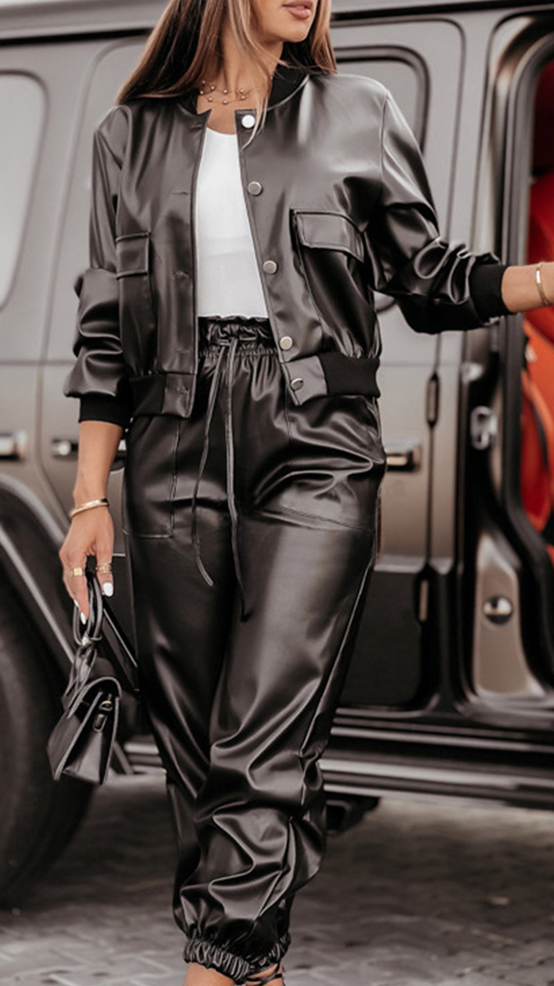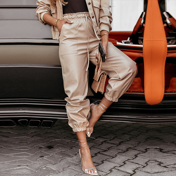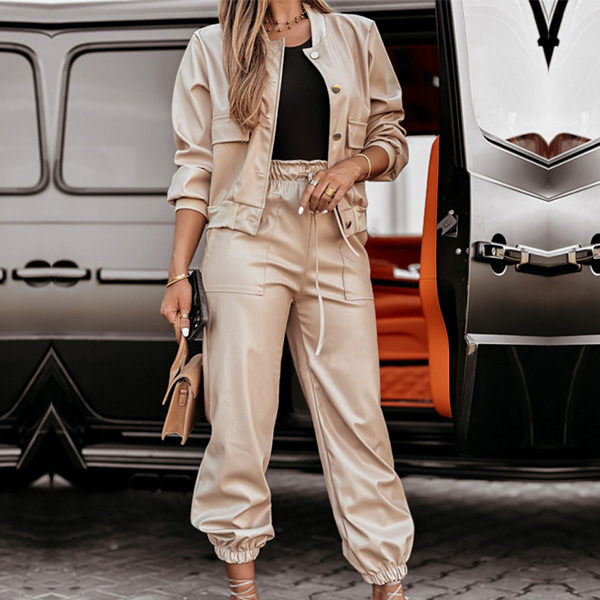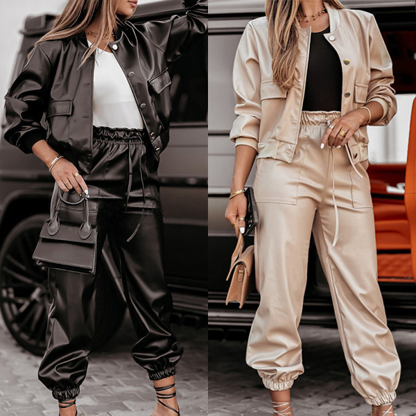 Punk Fashion Artificial Leather PU Two-piece Set Consist of Jacket and Drawstring Pants