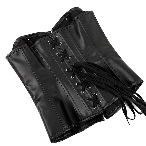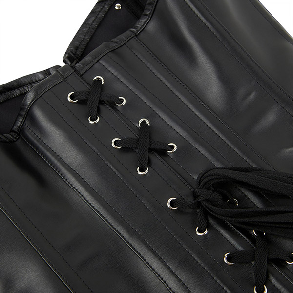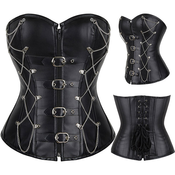 This is a bold and edgy strapless corset that combines a faux leather PU material, criss-cross chain detail, and front buckle design for a punk-inspired and rebellious look. Pair it with ripped jeans or a mini skirt for a punk-inspired and edgy look.