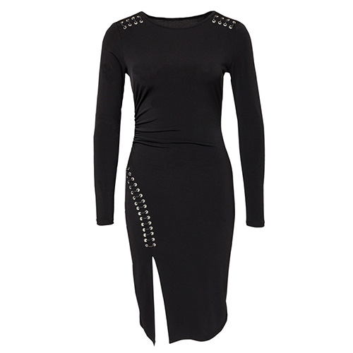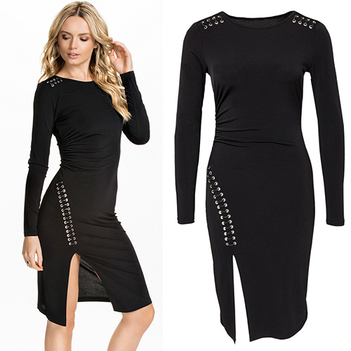 with long sleeve,round neck and slit hemline design. If pairing it with your sexy black high-heeled shoes,