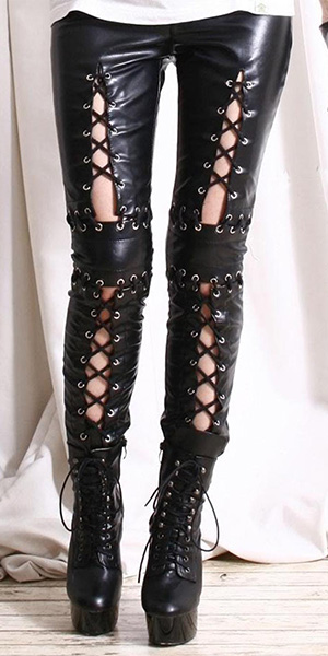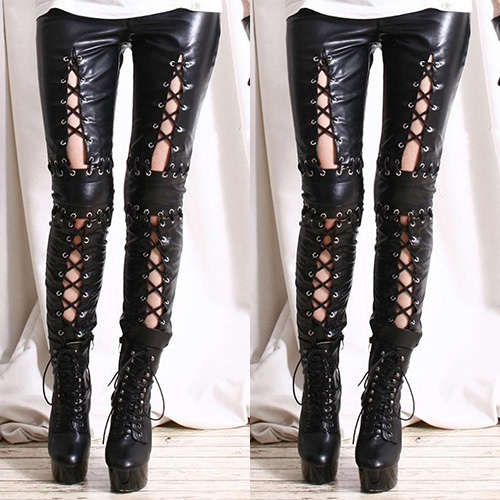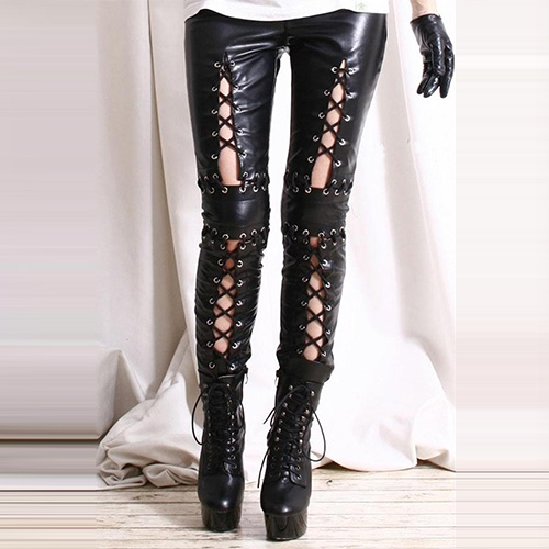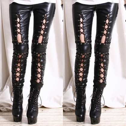 Punk Style Solid Color Lace-up Hollow Out Skinny Pants For Women