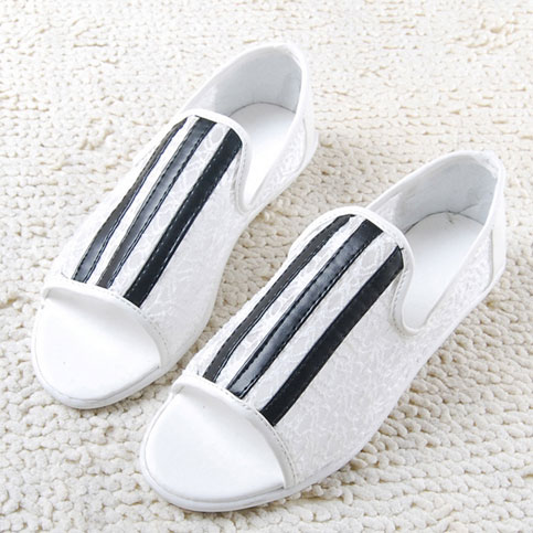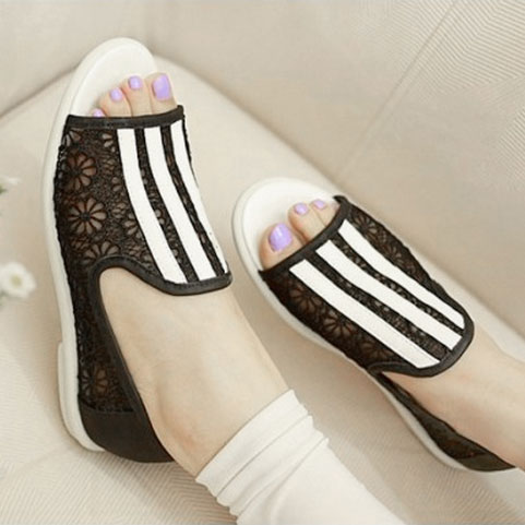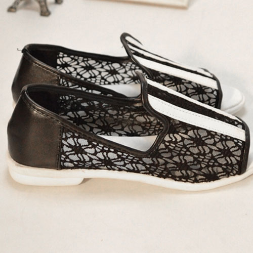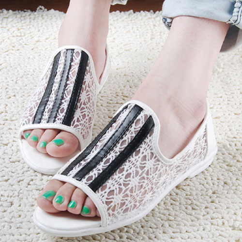 These flats feature a mesh upper with contrasting faux leather stripes and floral lace details,an open toe,durable rubber sole.Pair these stylish kicks with crop tops and skinny pants for a street style.