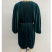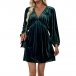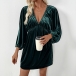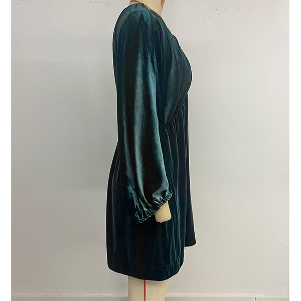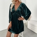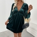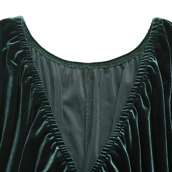 Retro Deep V Neck Velvet Dress with Lantern Sleeves and Pleated Detail