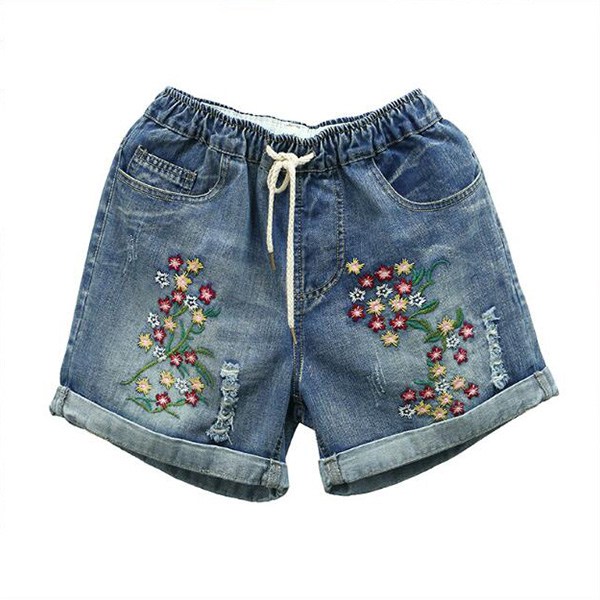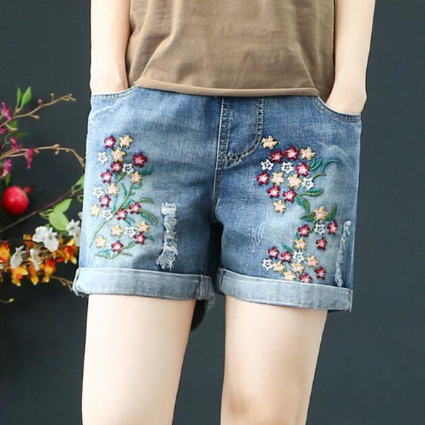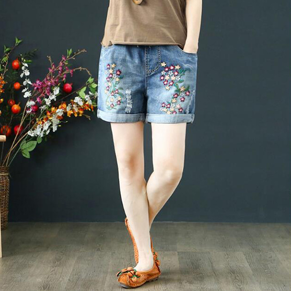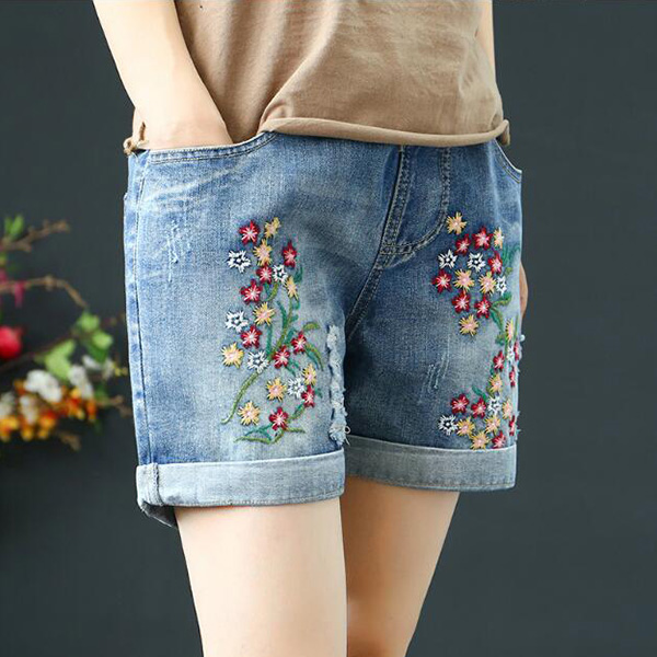Retro Floral Embroidery Denim Rolled Hem Shorts