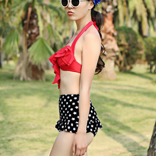The beautiful bikini top features falbala and lace up design, which makes it more sexy. And panty with retro pentagram print. Dress it,you are the beach beauty.