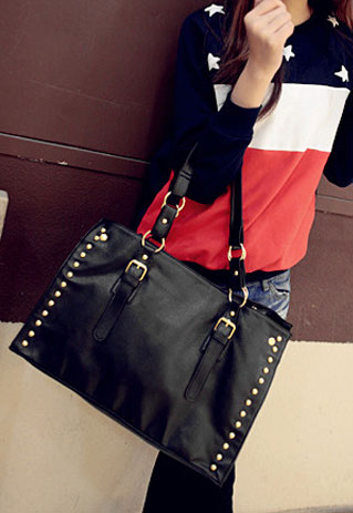 Hang bag? Shoulder Bag? That is your choice. Cool or gorgeous? That is your choice too. Featuring the optional strap, this bag could be use as a handbag or a shoulder bag. With the solid color-black and the rivet design, it is easy match. Companied by your frayed sweater and your jean jacket, it would be a punk style cool bag. Pair with a solid color blazer; it would be gorgeous and stylish. Choose it, and show your own style.