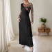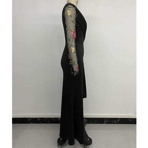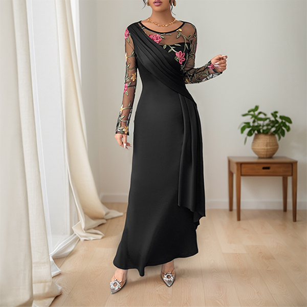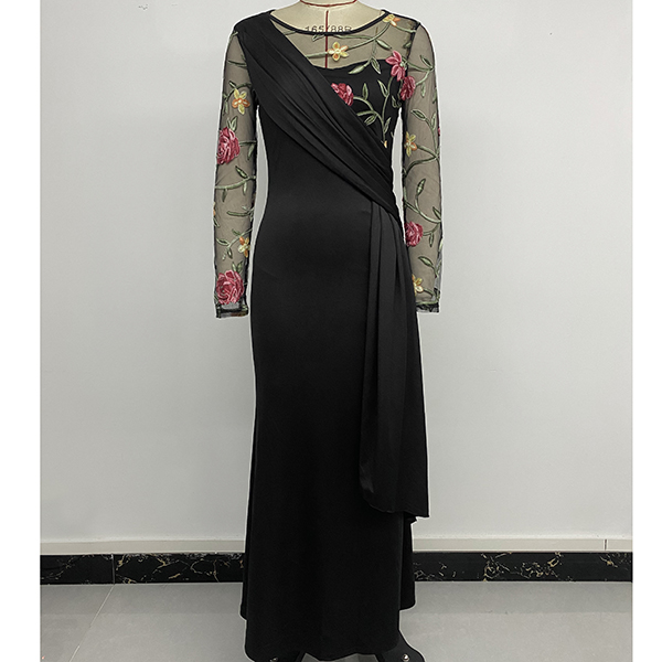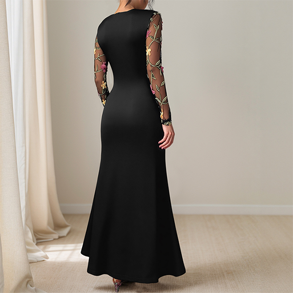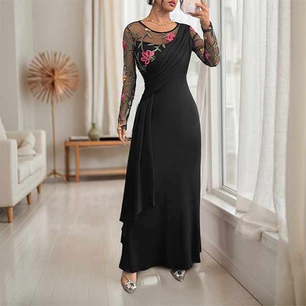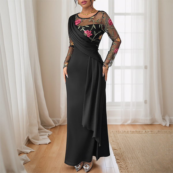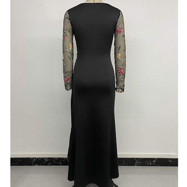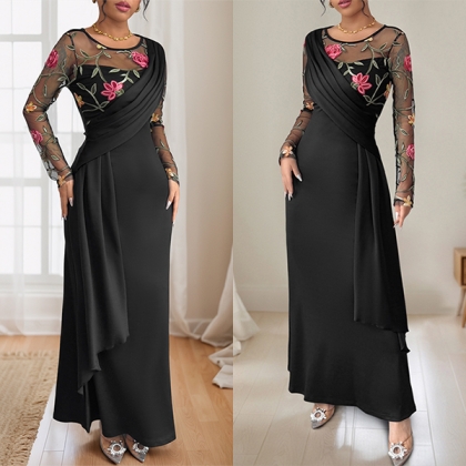 Vintage Floral Emboridery Gauze Spliced Crew Neck Long Sleeve Midi Dress