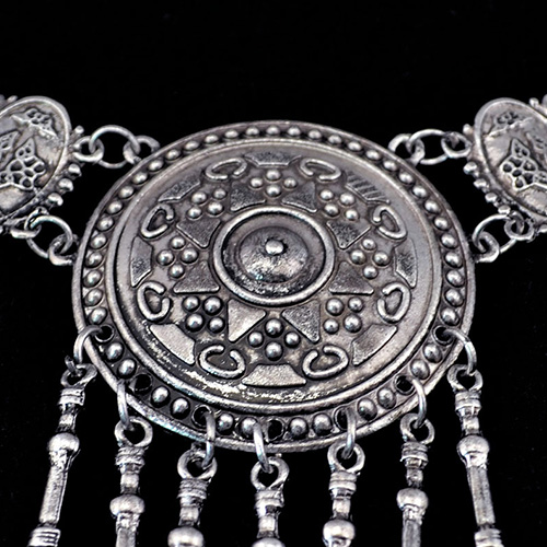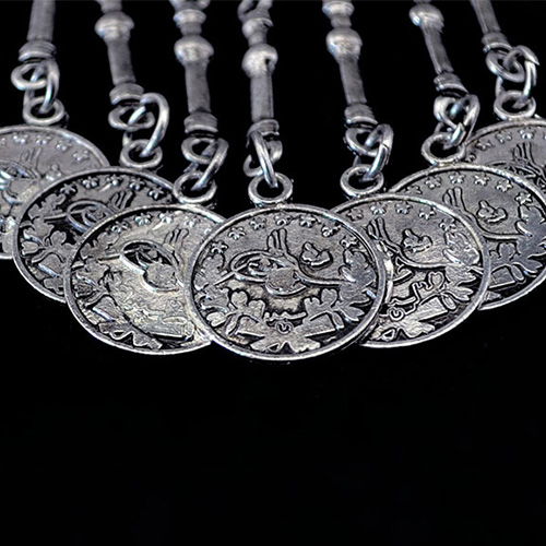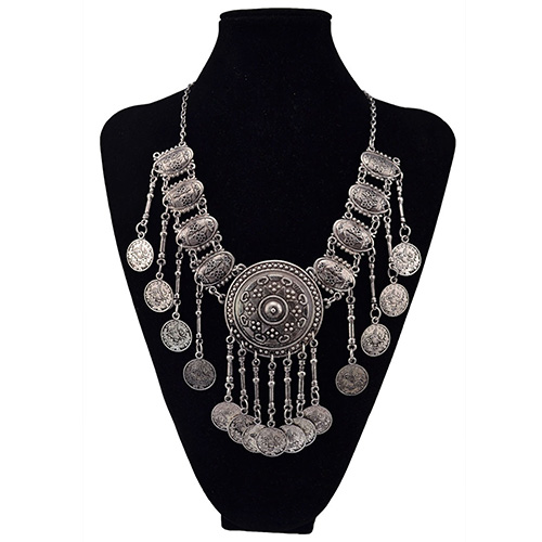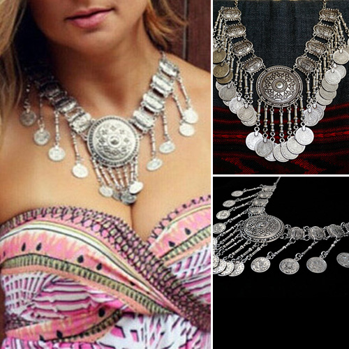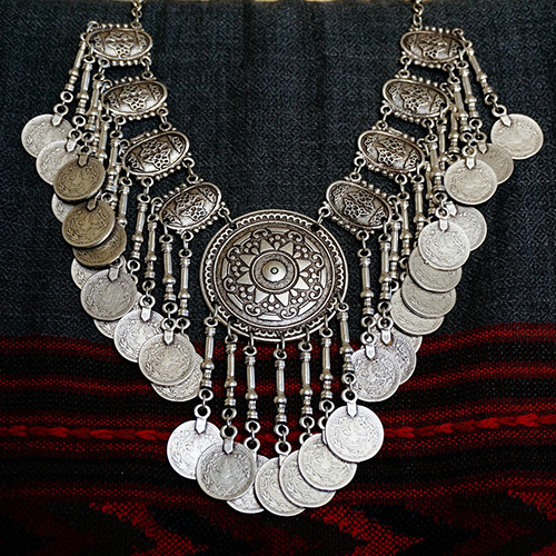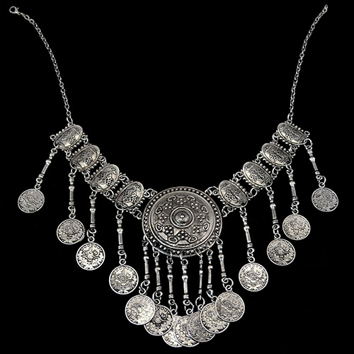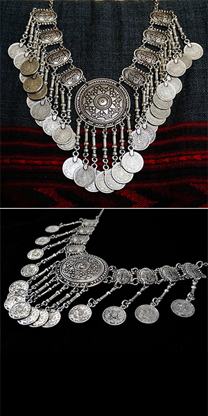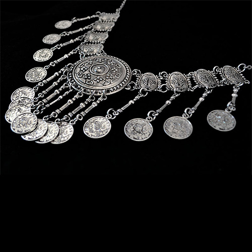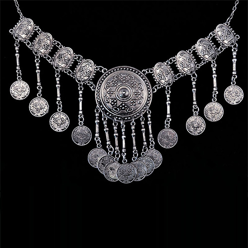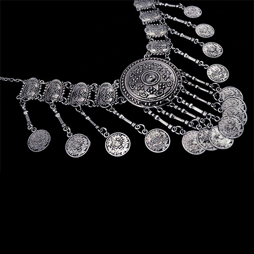 As pictures show, this piece of necklace is decorated with many coin tassels, which makes