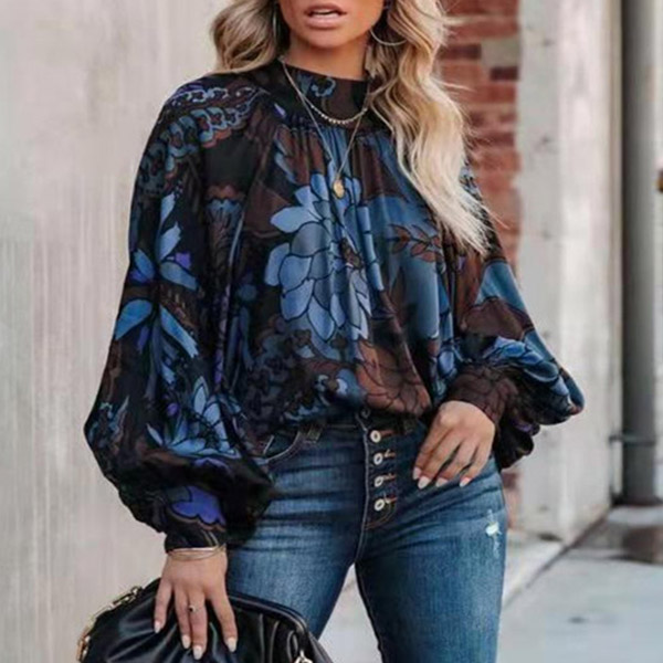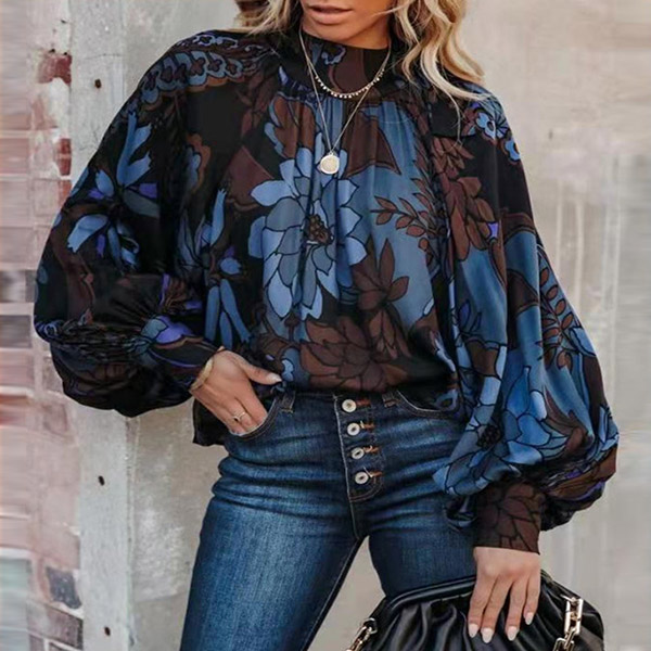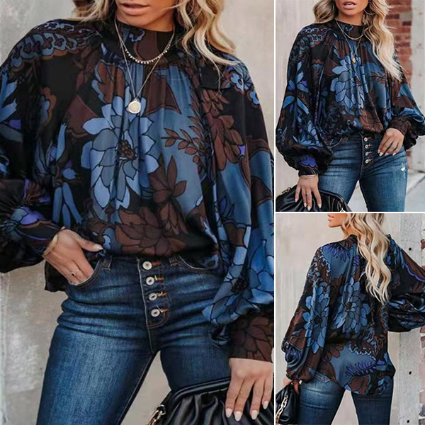 Retro Style Lantern Sleeve Mock Neck Loose Printed Chiffon Top