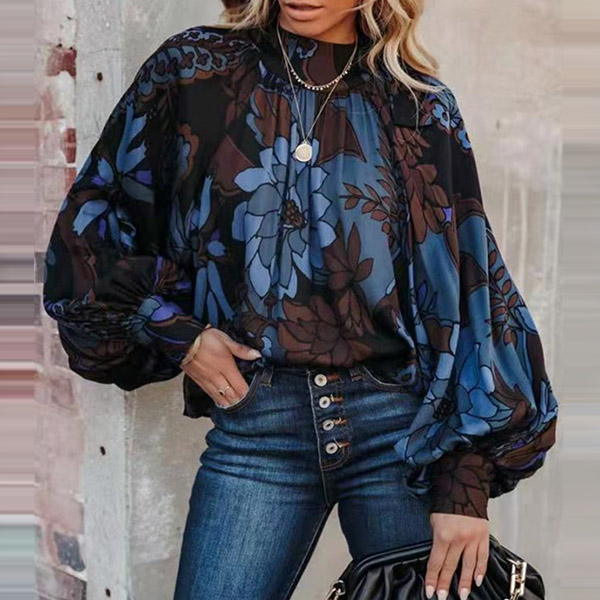 Retro Style Lantern Sleeve Mock Neck Printed Loose Top