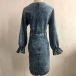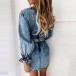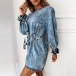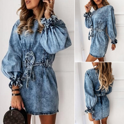 Retro Style Lantern Sleeve Round Neck Slim Fit Denim Dress