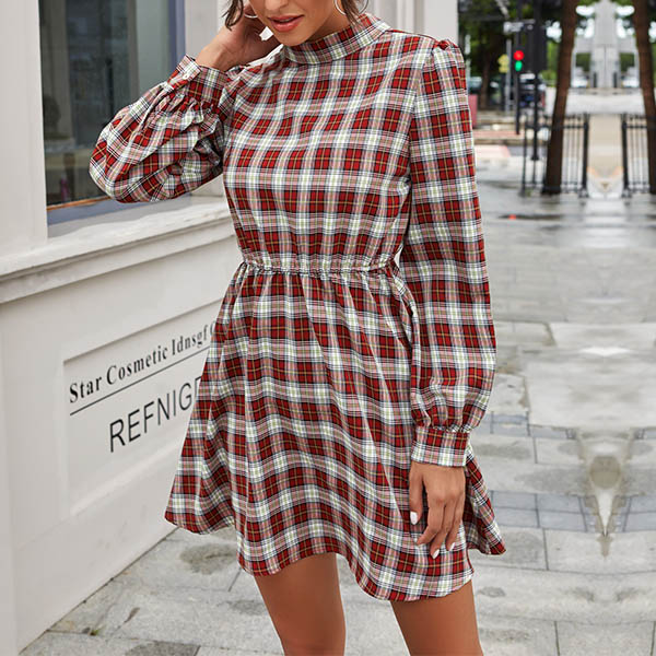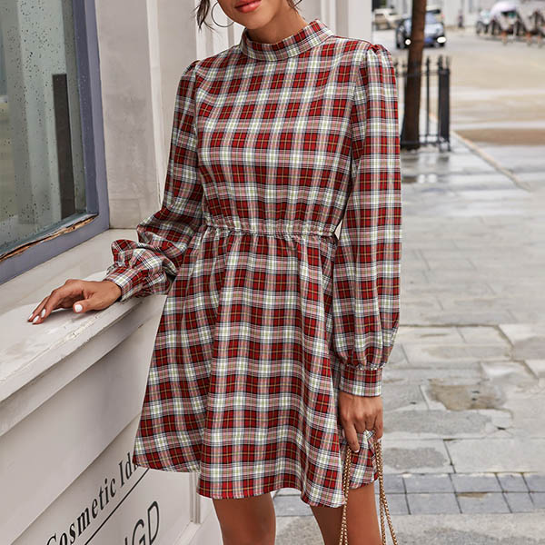 Retro Style Long Sleeve Mock Neck Plaid Dress