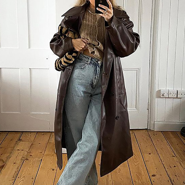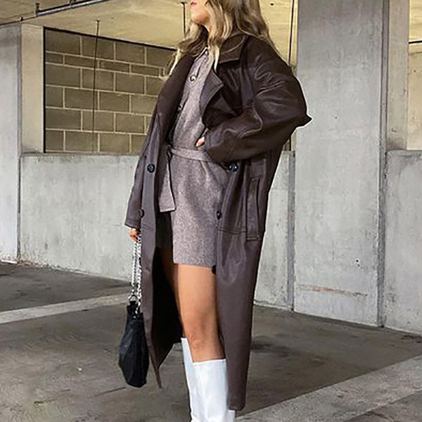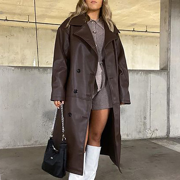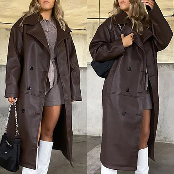 For a charming and stylish autumn and winter look,you can trust in this PU leather windbreaker coat. The brown tone design makes it look retro yet sassy. Finished with long sleeve,notched lapel,double-breasted and slanted pockets,this PU leather coat can keep the warmth,comfy while it maintains your style.