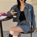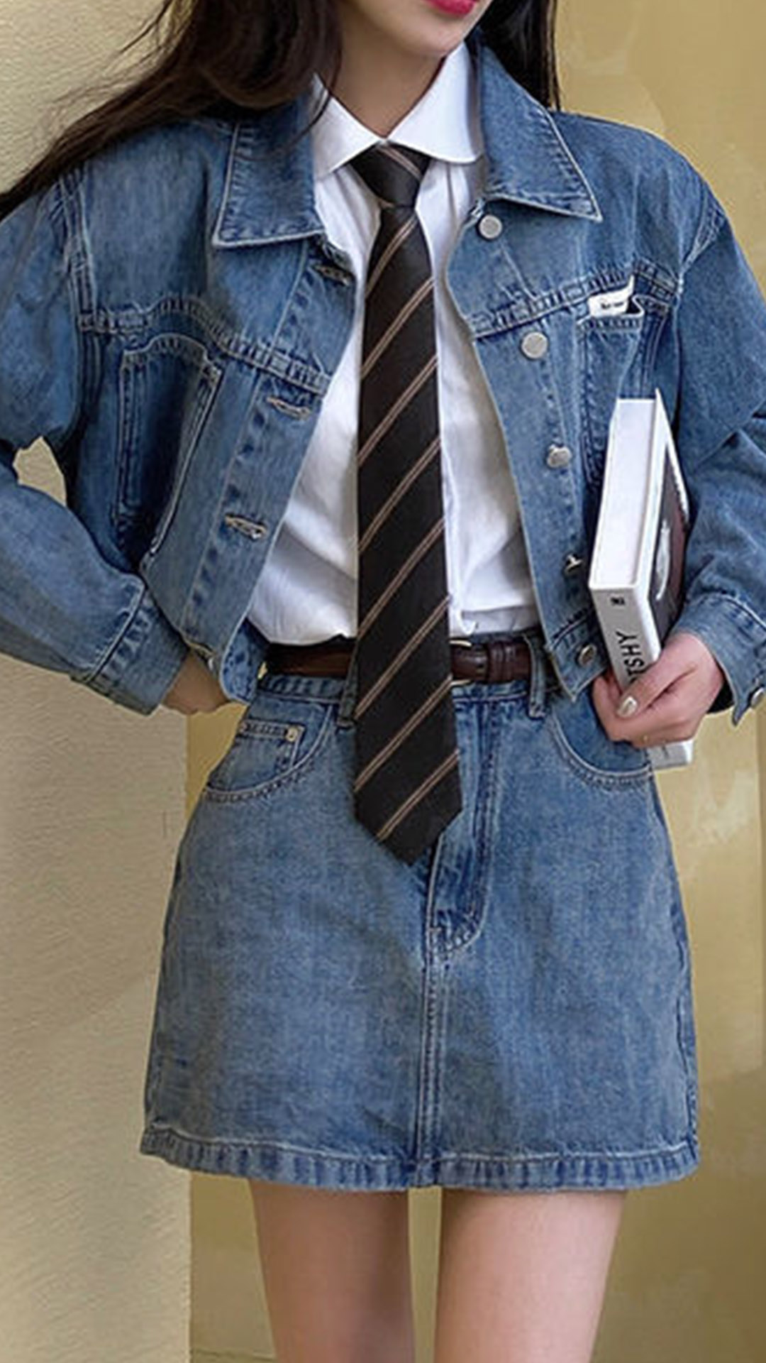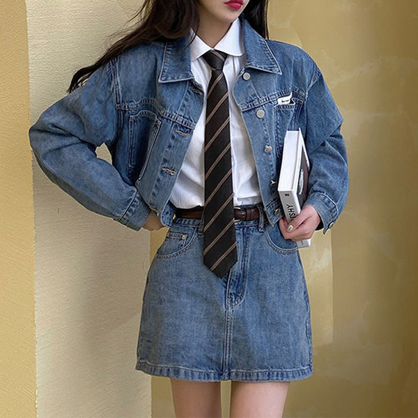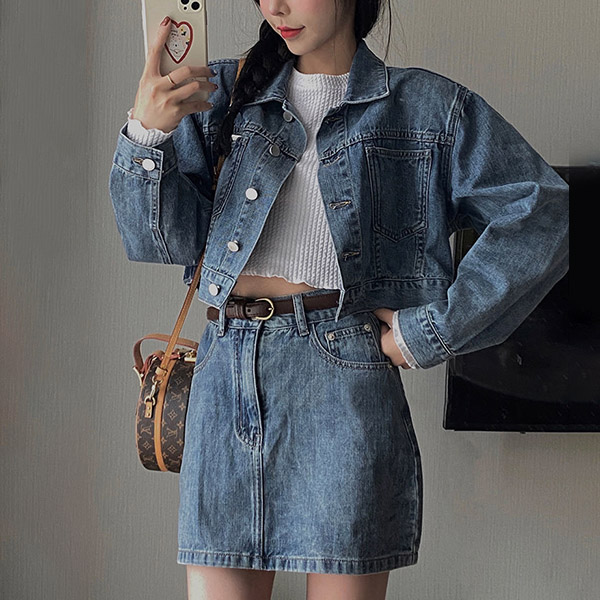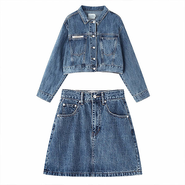 The denim series that combines of stylish and cozy will make your wardrobe more complete. So we suggest you choosing this denim two-piece set. Come with a short-style coat and a high waist slim fit skirt,this two-piece set can better showcase your perfect figure. You can match with your simple style top to create a casual,retro yet fashionable daily dress up.